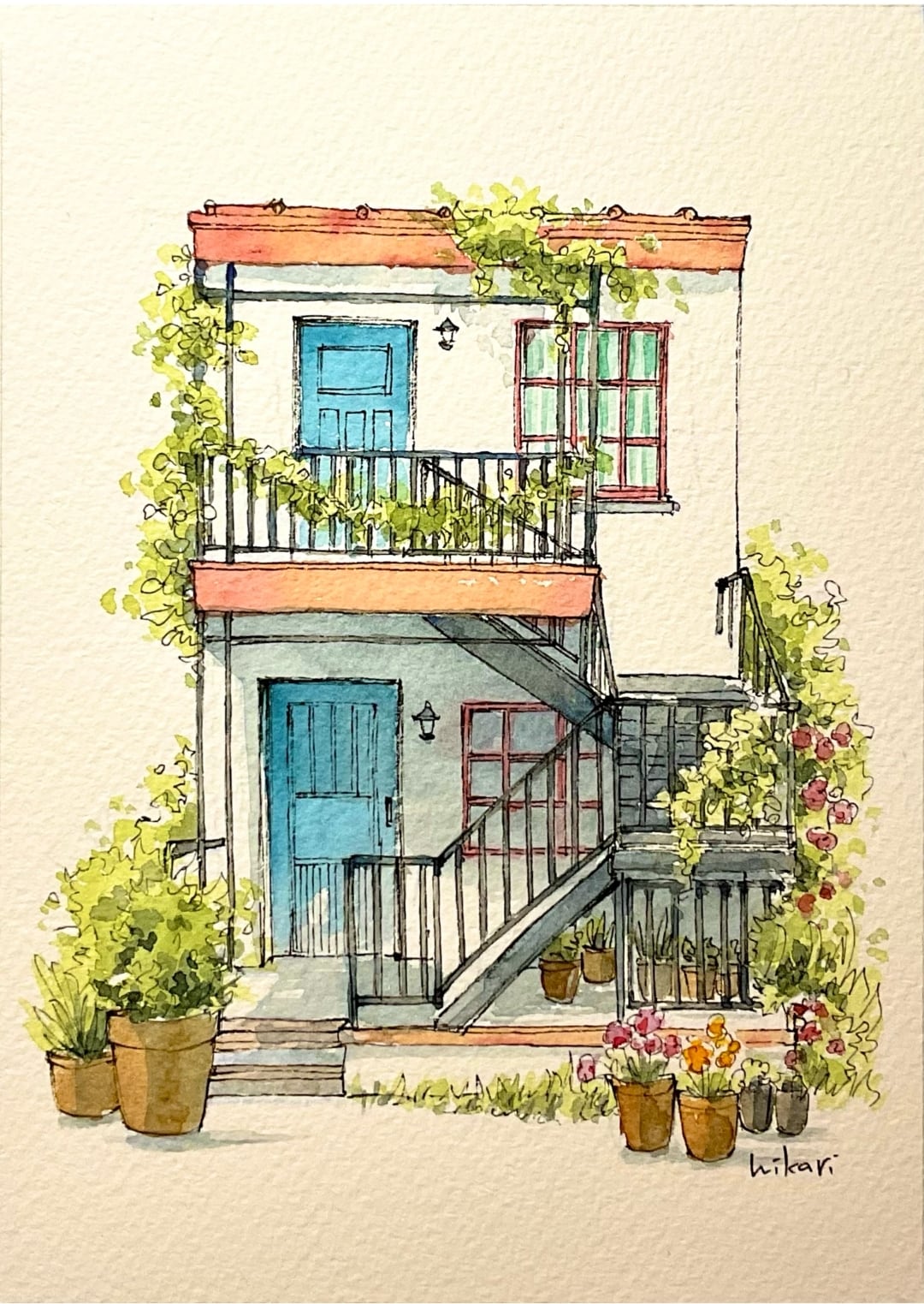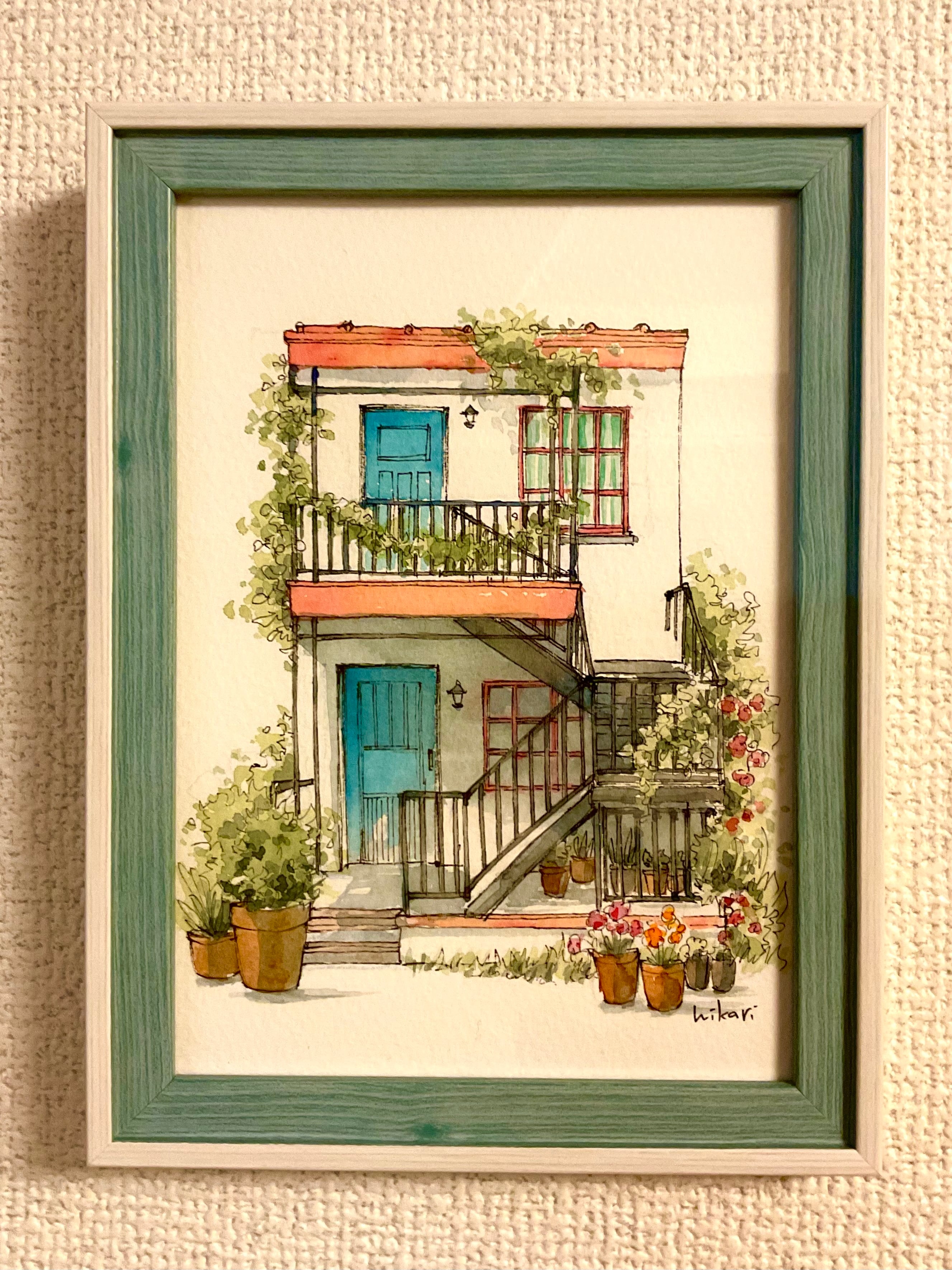 ペン画に透明水彩で着した作品です。