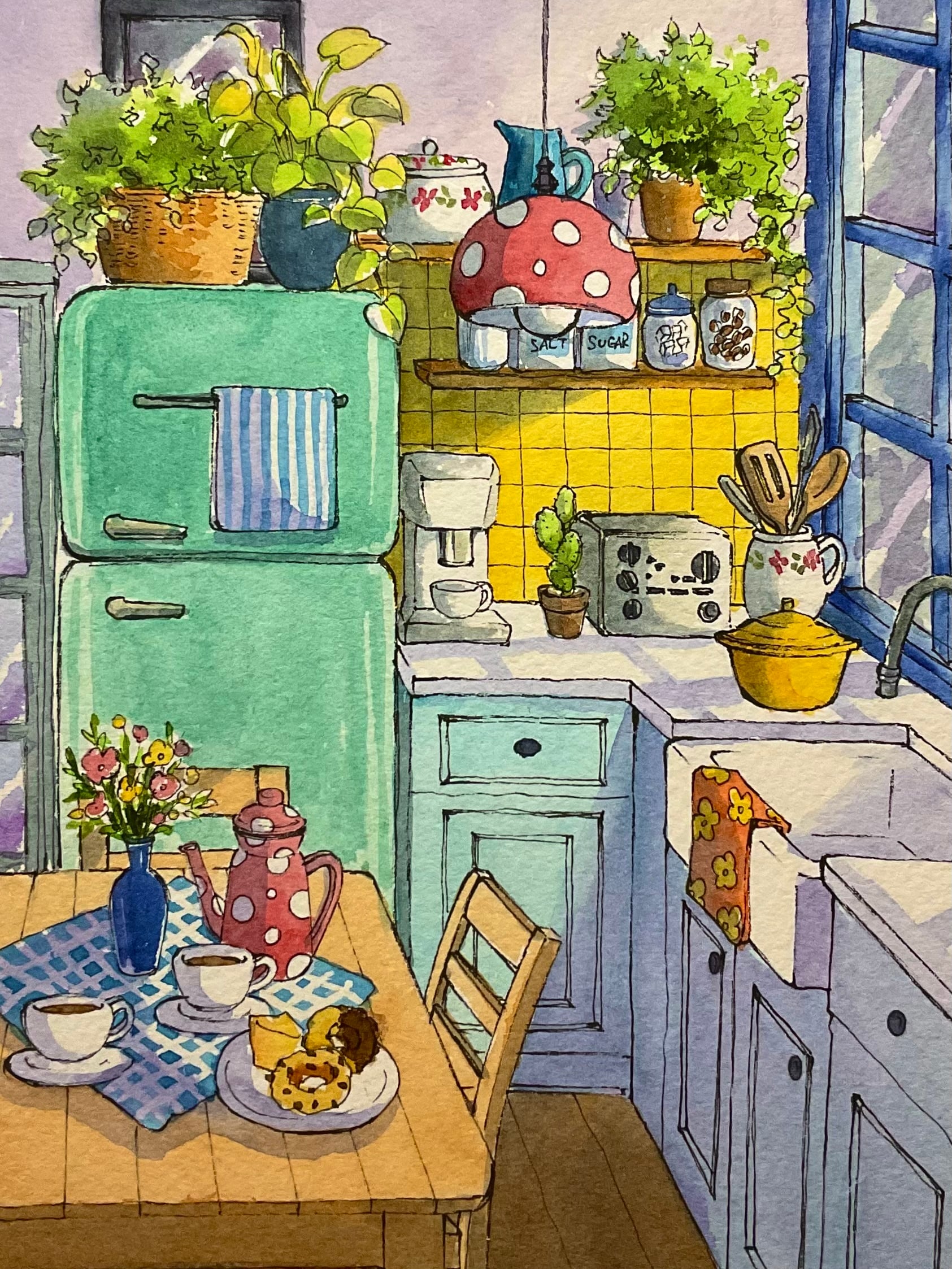ペン画に透明水彩で着彩した作品です。