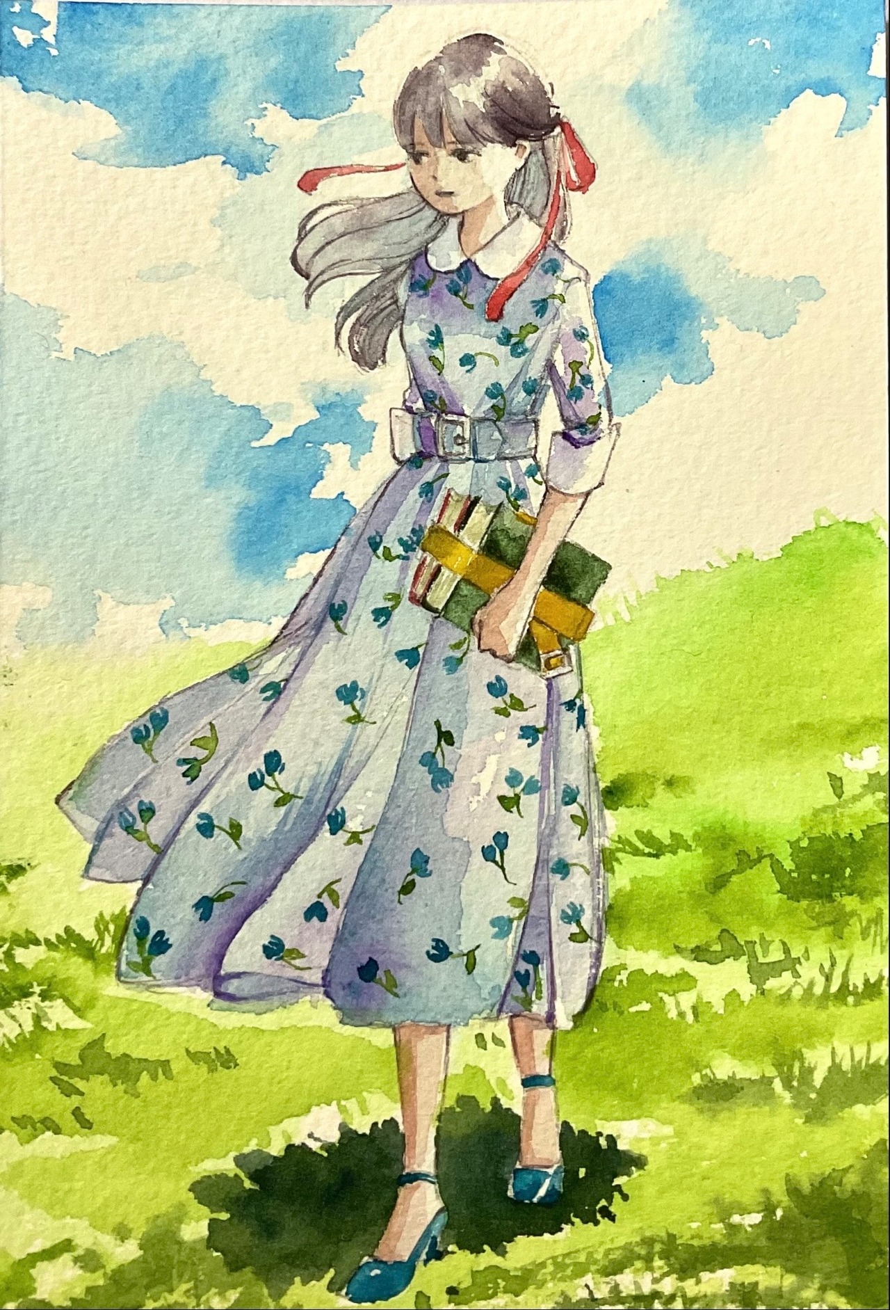 青い空と原っぱをバックに描いた女の子です。